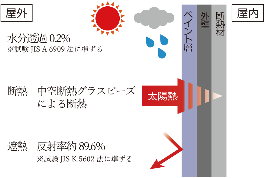 - 断熱に最も効果を発揮する空気を中空グラスビーズの中に閉じ込め、優れた断熱性を有しています。また、赤外線の反射に高い効果を発揮する添加物を独自の製法で加工することによって高い反射性能を発揮します。